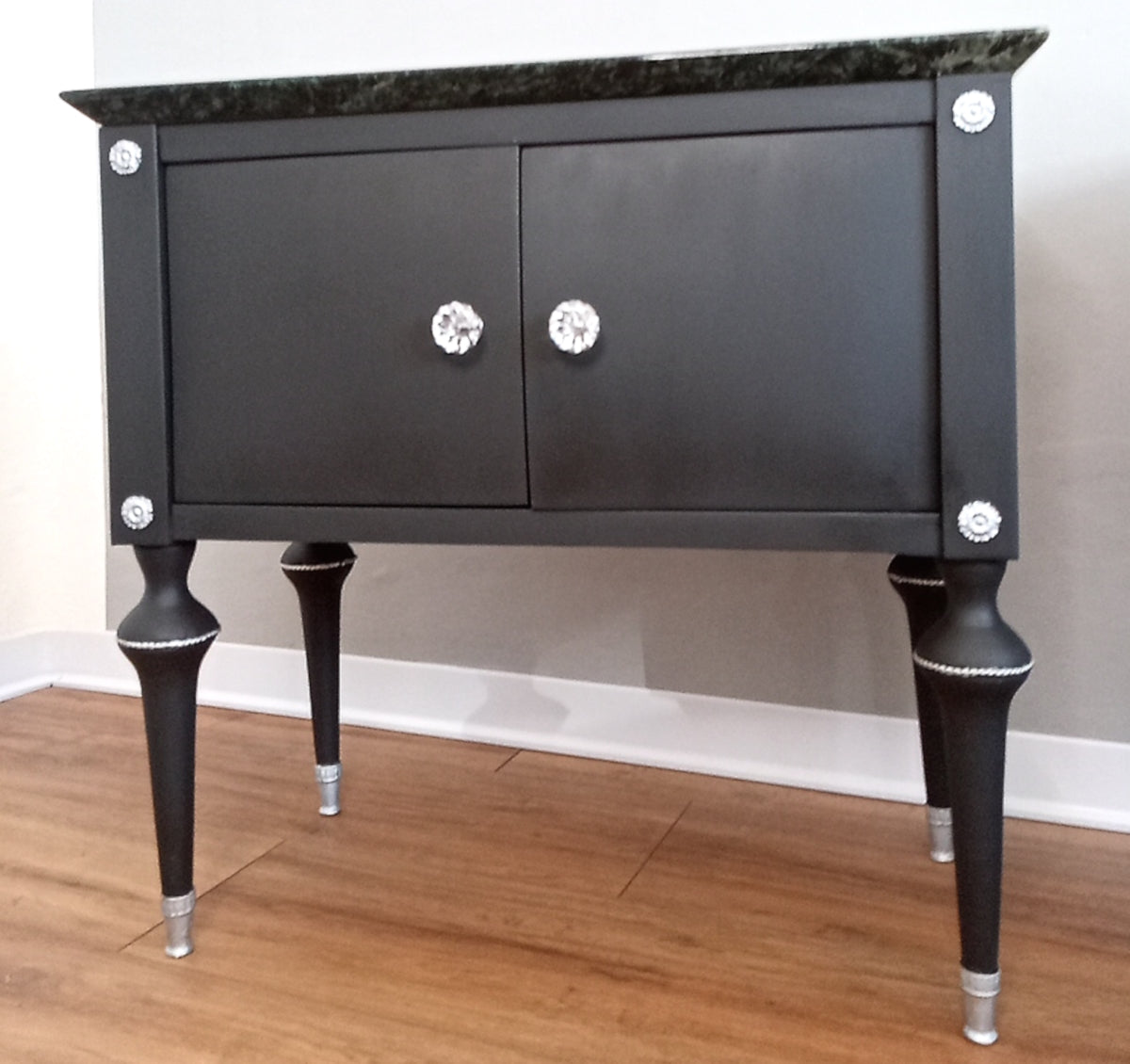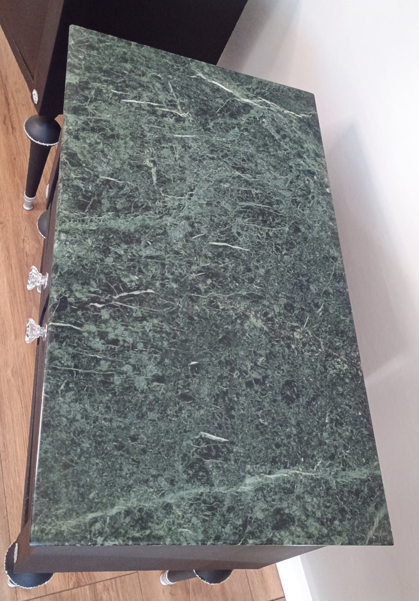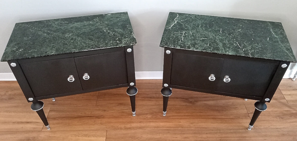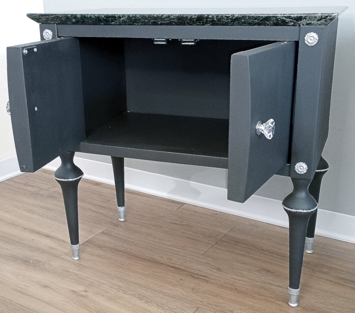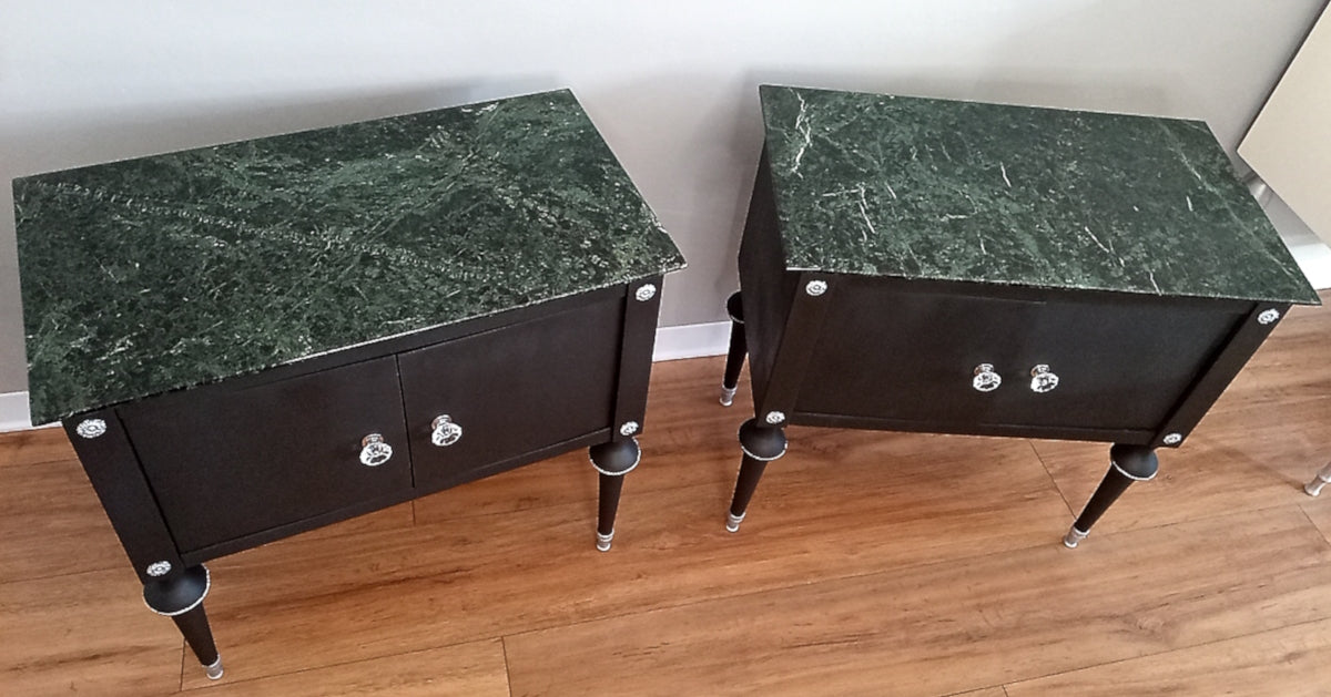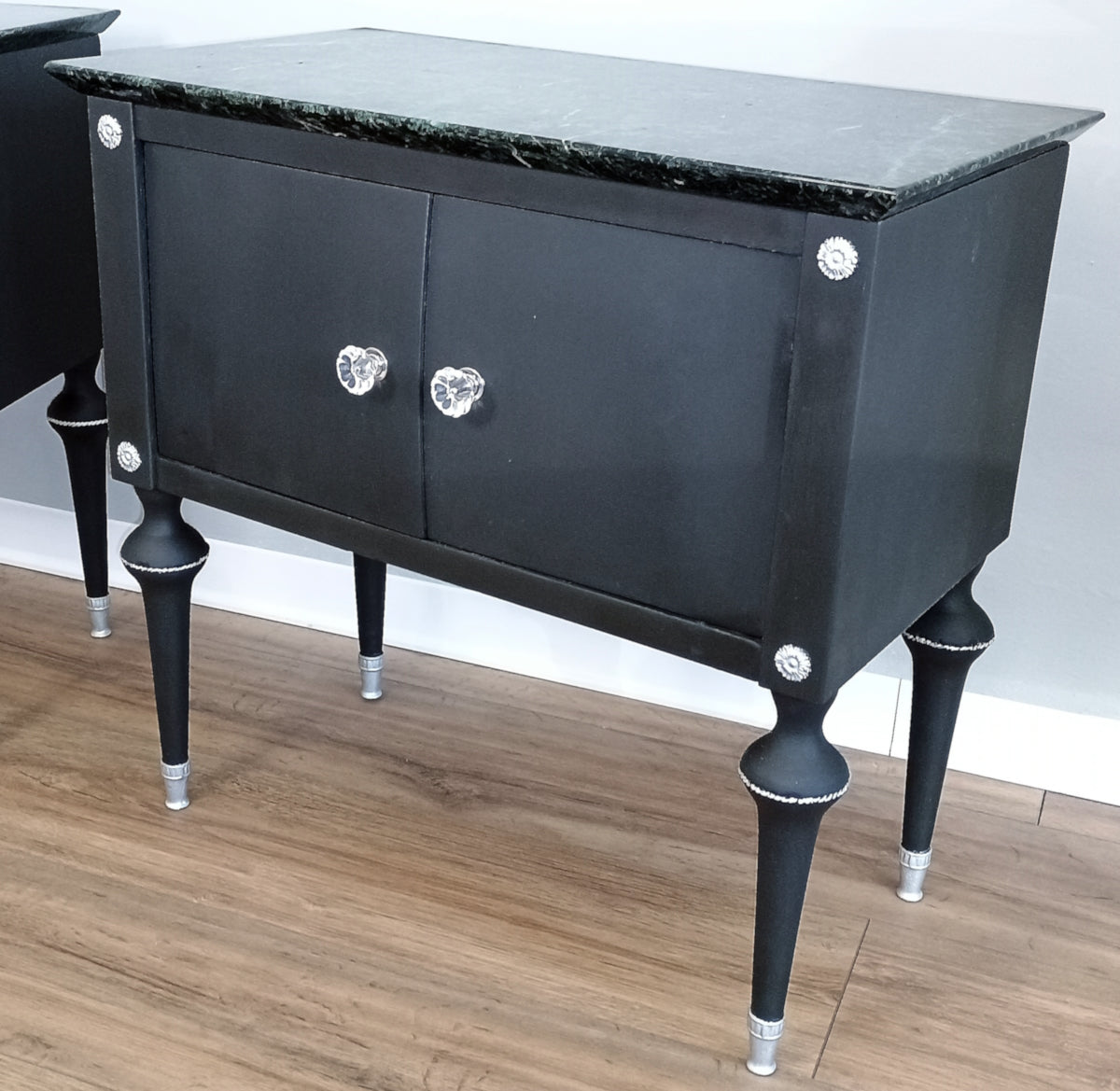 Euro 90,00NO SPEDIZIONERITIRO IN SEDE CON MEZZI PROPRI POSSIBILITA’ DI CONSEGNA A PAGAMENTO DA CONCORDAREComodini eleganti, dipinti a mano, con top in marmo verde e dettagli color argento.