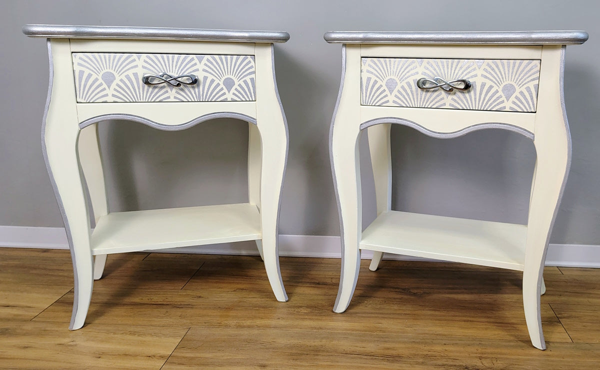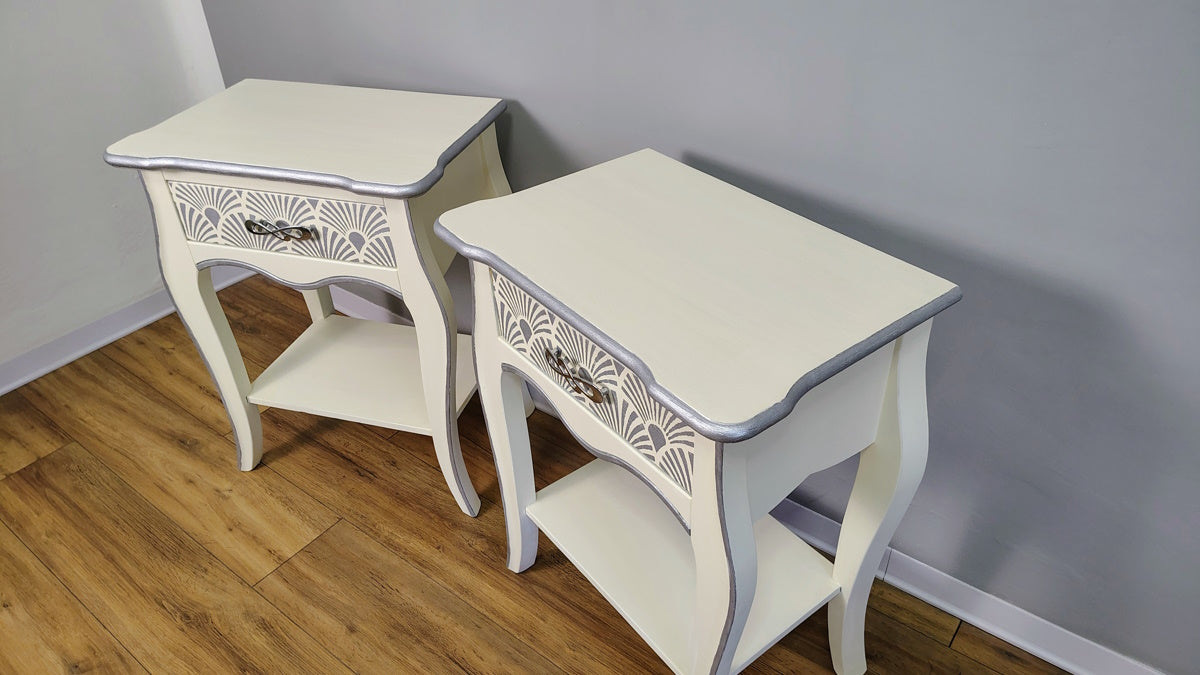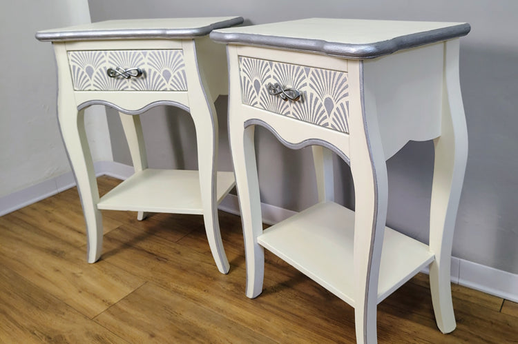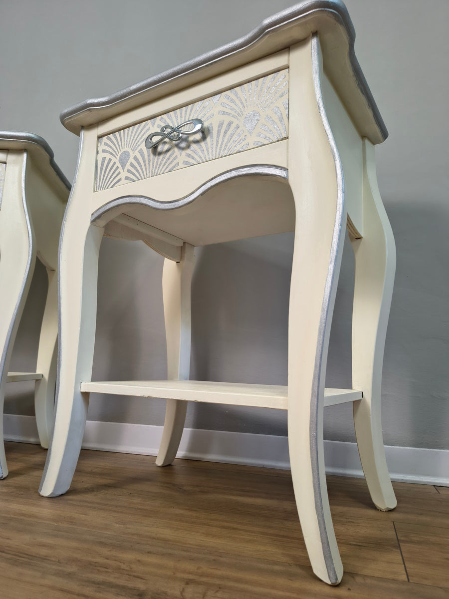 Coppia comodini bianchi con dettagli argento in legno massello dipinti a mano marca Zanini.Misure:Larghezza 54 cmAltezza 69 cmProfondità 35 cm