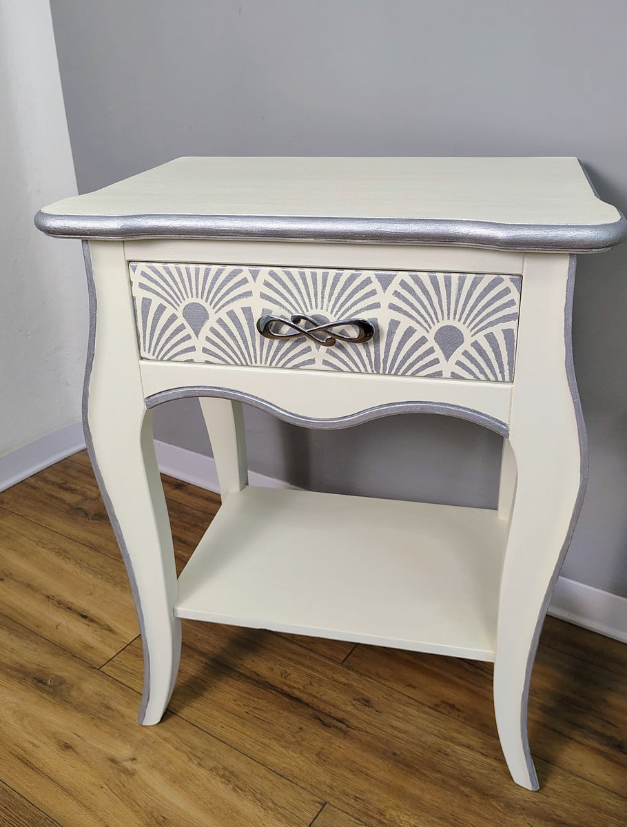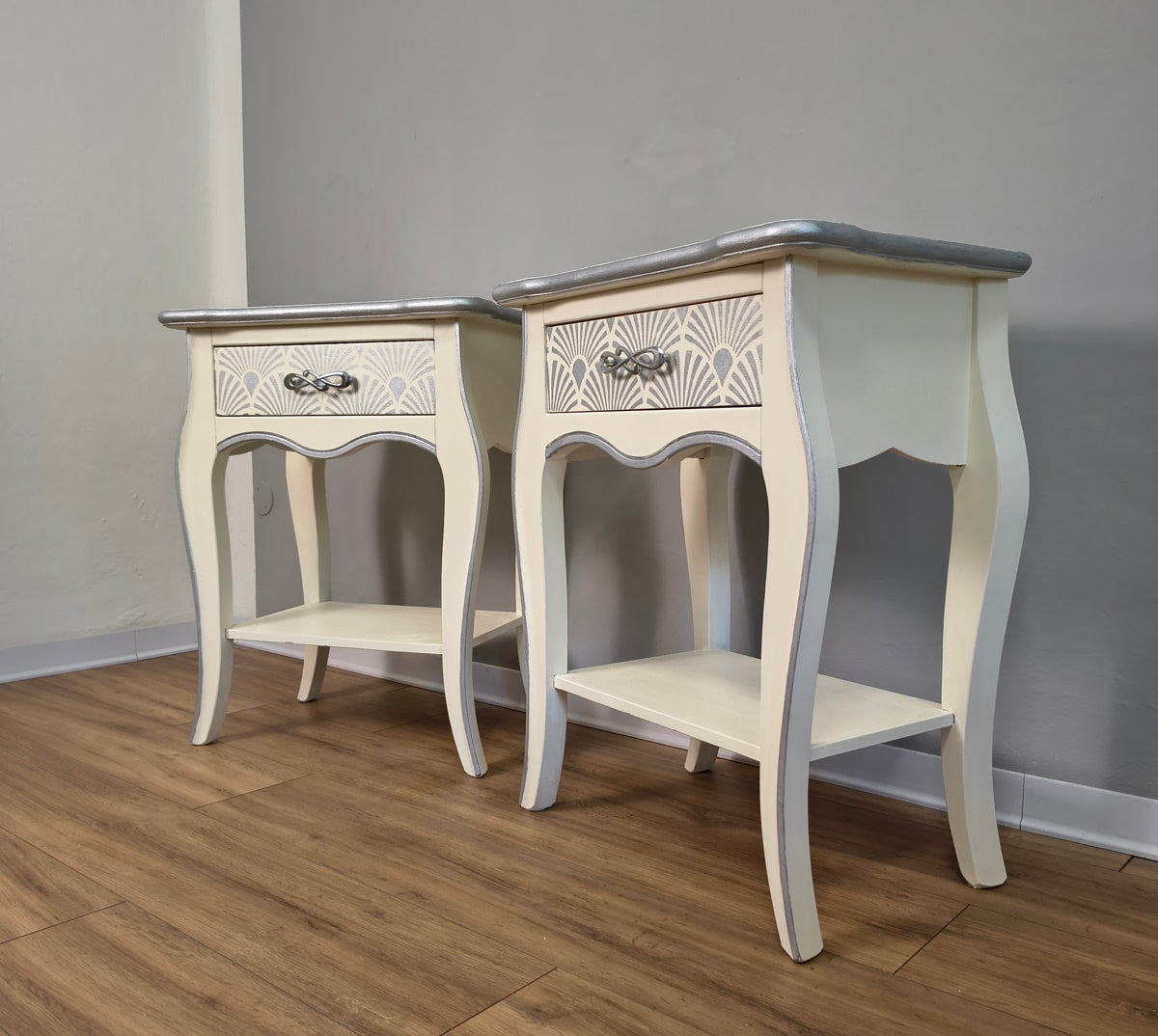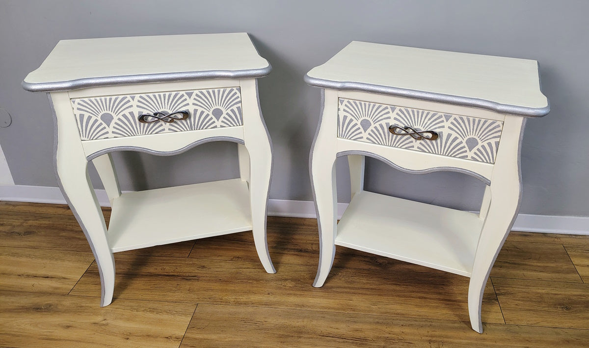 Coppia comodini bianchi con dettagli argento in legno massello dipinti a mano marca Zanini.Misure:Larghezza 54 cmAltezza 69 cmProfondità 35 cm