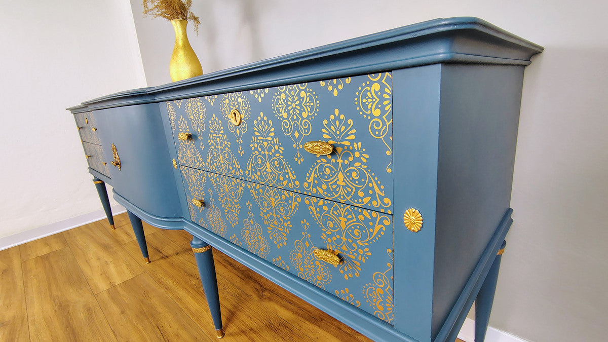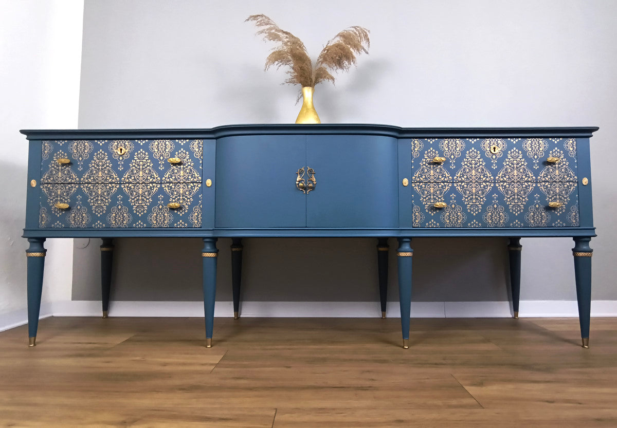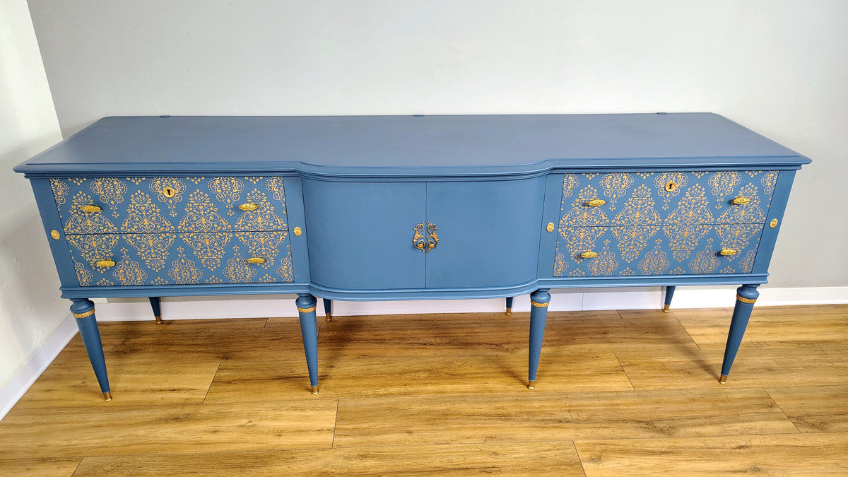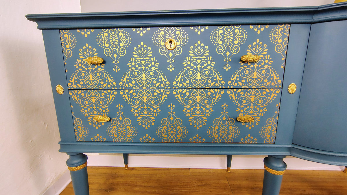 Madia anni '50 color ottanio peacock dipinta a mano con dettagli color oro e transfer Kacha-Redesign.Misure:Larghezza 195 cmAltezza 72 cmProfondità 53 cm