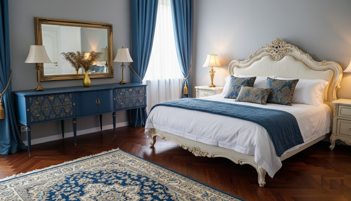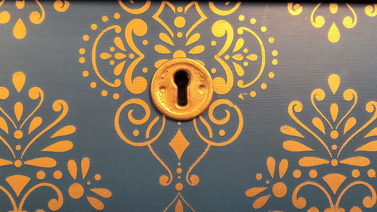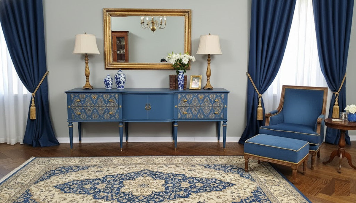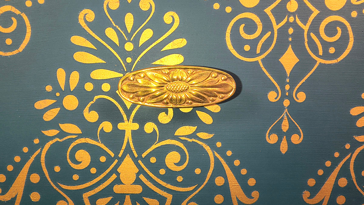 Madia anni '50 color ottanio peacock dipinta a mano con dettagli color oro e transfer Kacha-Redesign.Misure:Larghezza 195 cmAltezza 72 cmProfondità 53 cm