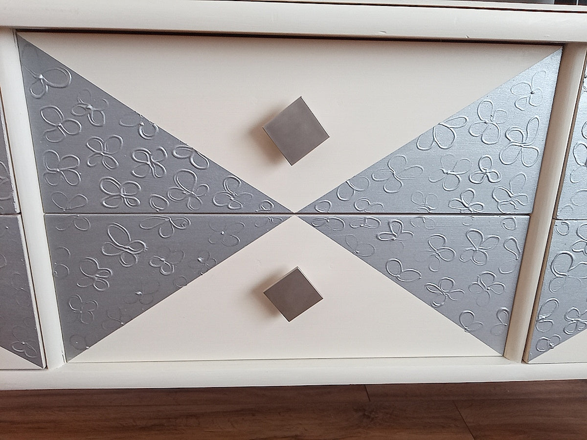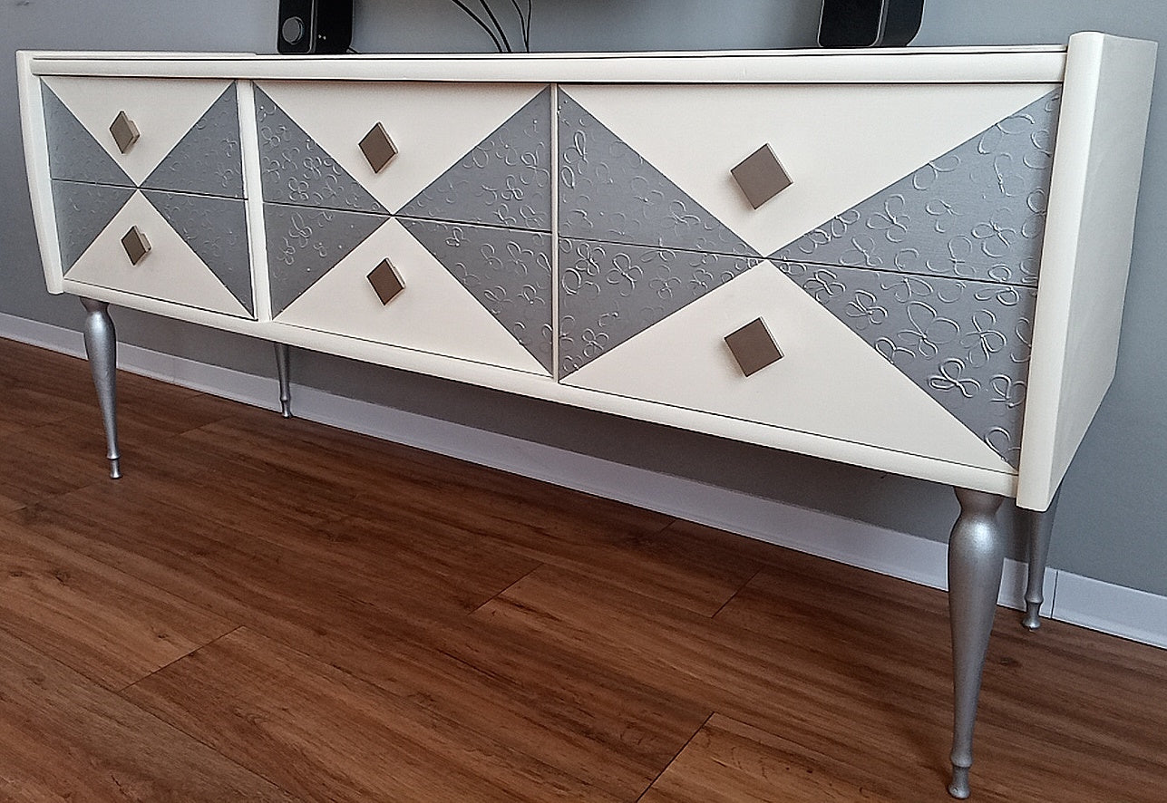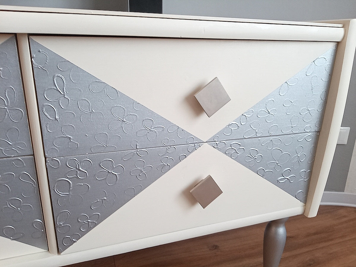 Bellissima ed elegante madia moderna dipinta a mano con pomelli in metallo e gambe argentate.