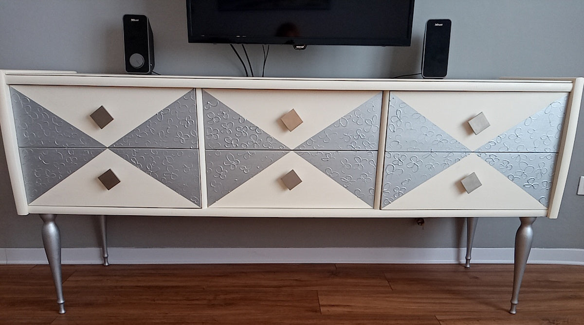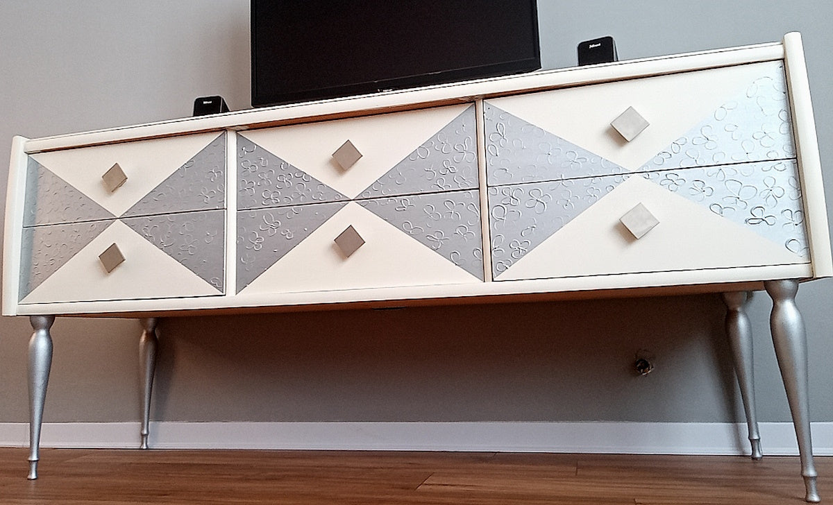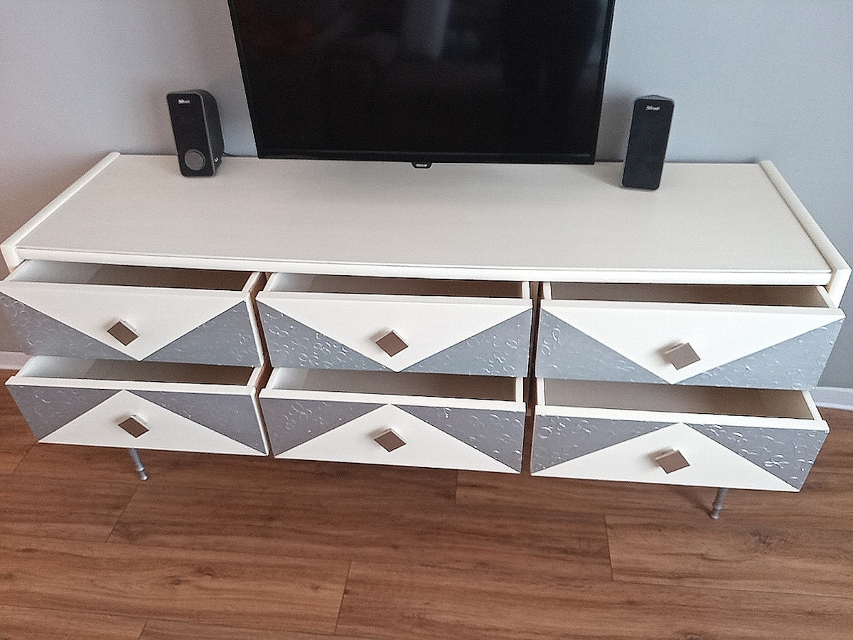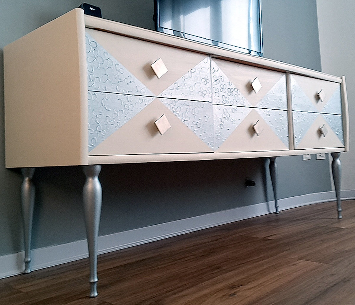 Bellissima ed elegante madia moderna dipinta a mano con pomelli in metallo e gambe argentate.