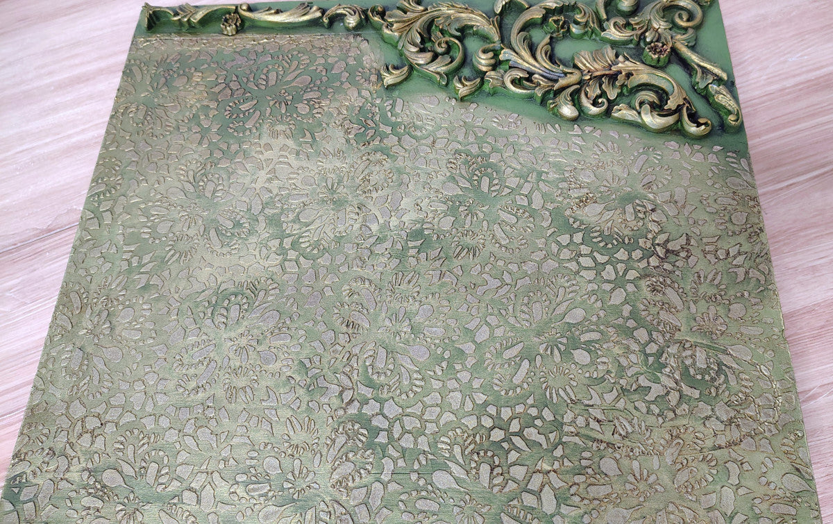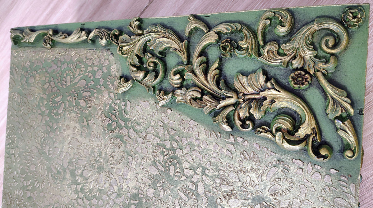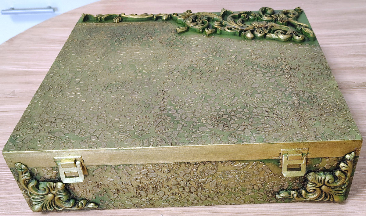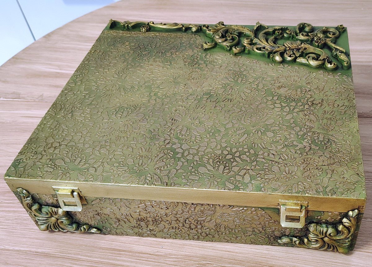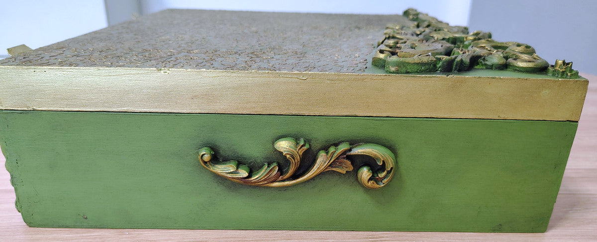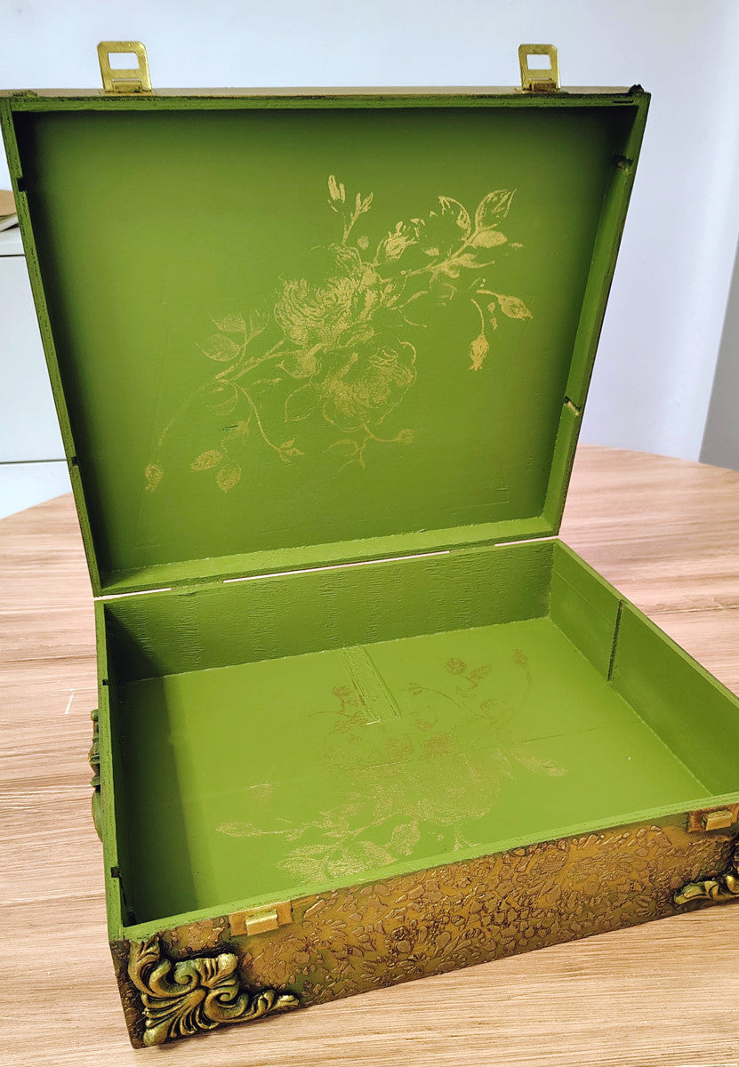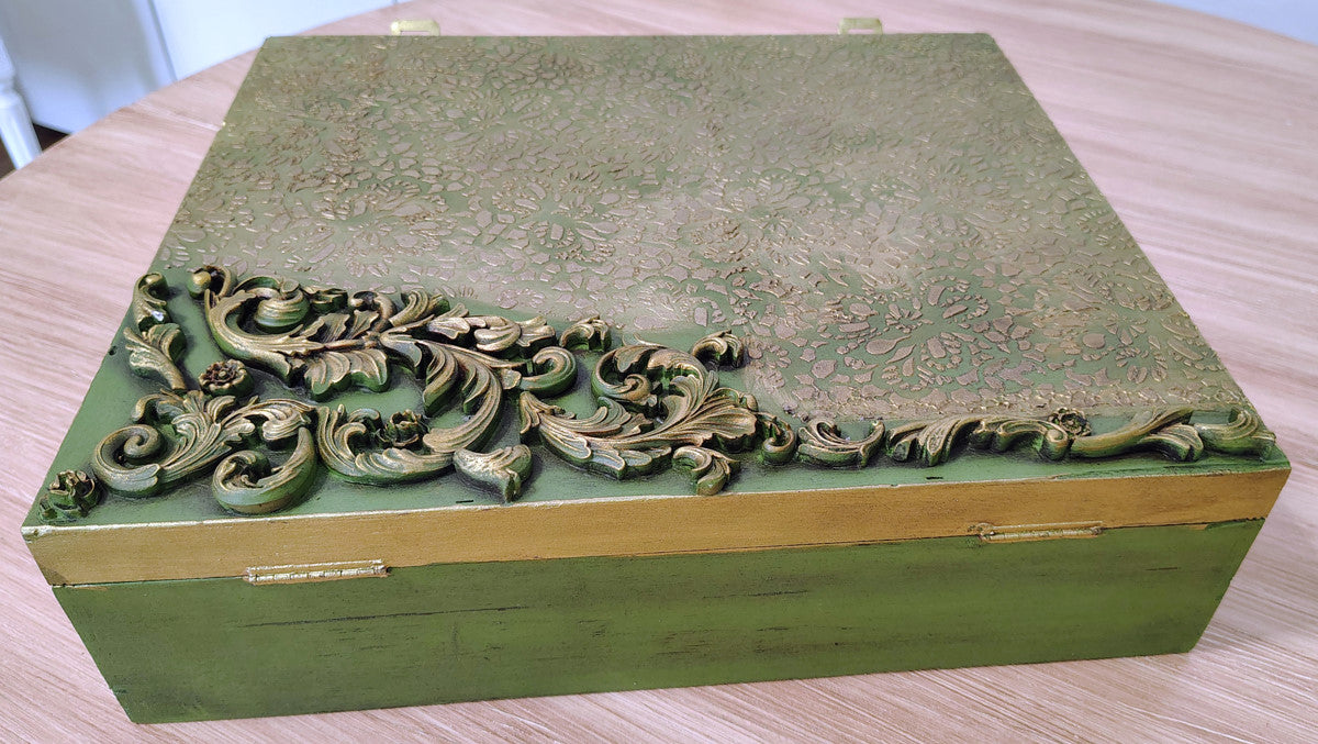 Scatola dipinta con il nostro verde Olive ed impreziosita con dei fregi preparati a mano con i nostri stampi e pasta di legno.Misure:Larghezza 39 cmAltezza 10 cmProfondità 34 cm