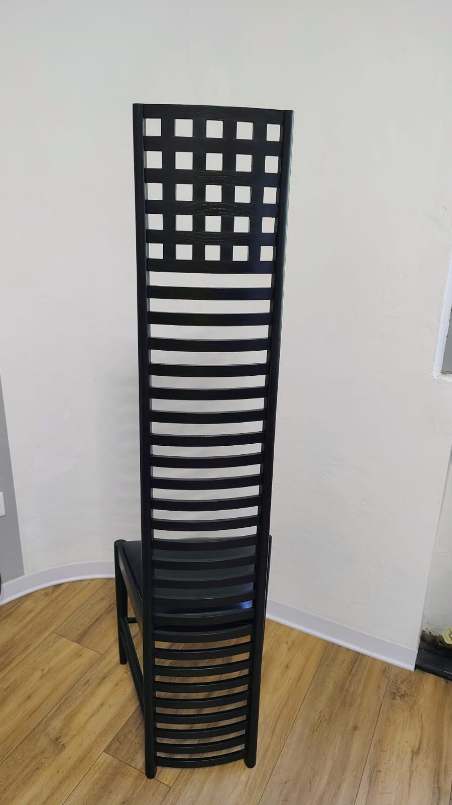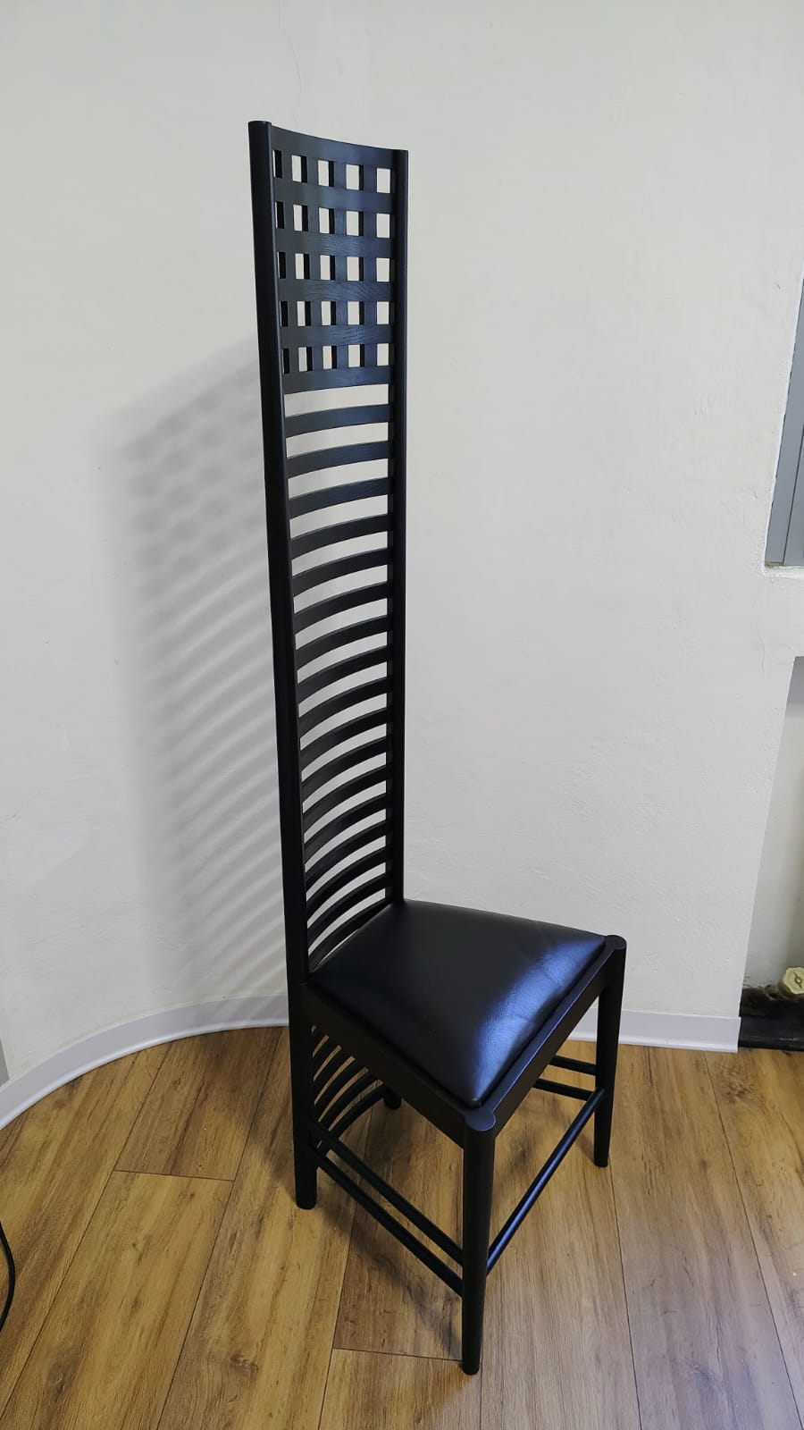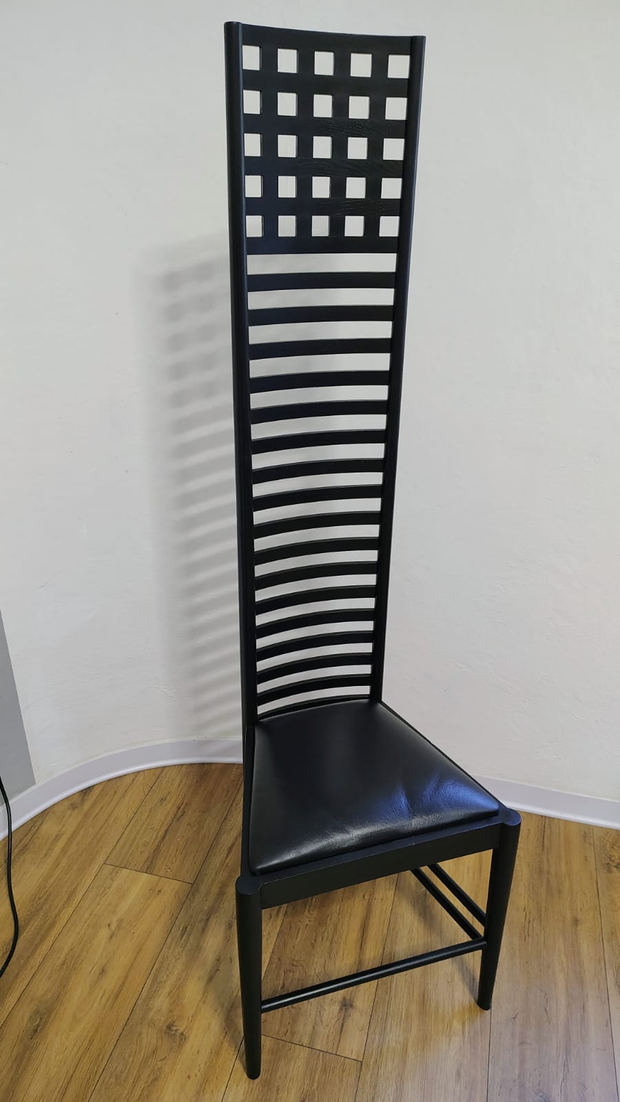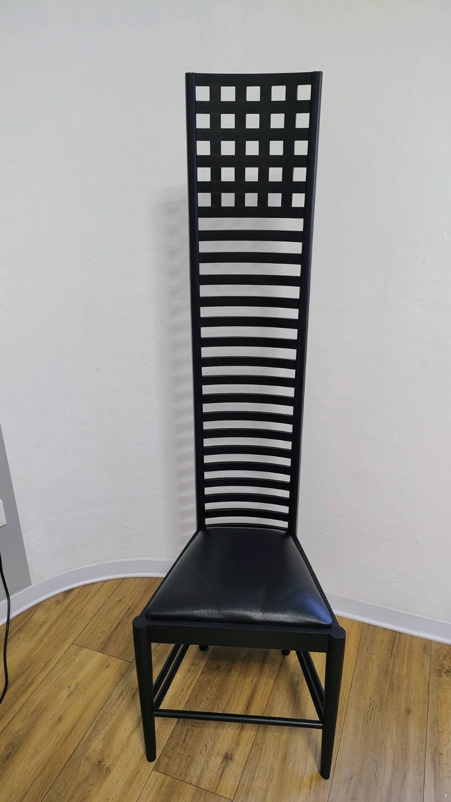 Riproduzione fedele di una Bauhaus Sedia Hill House Chair Mackintosh anni 80 con seduta in pelle, buone condizioni. Misure:Larghezza 42 cmAltezza 140 cmProfondità 35 cm